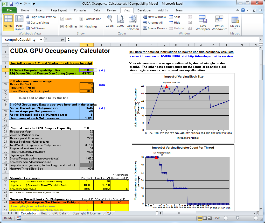 The reader is encouraged to refer to Section 4.2 “Hardware Multithreading” of the CUDA C Programming Guide for a method to calculate the amount of registers allocated for a block and the amount of shared memory allocated to a block for devices of different compute capabilities.